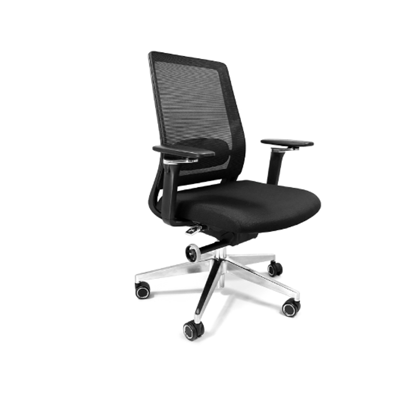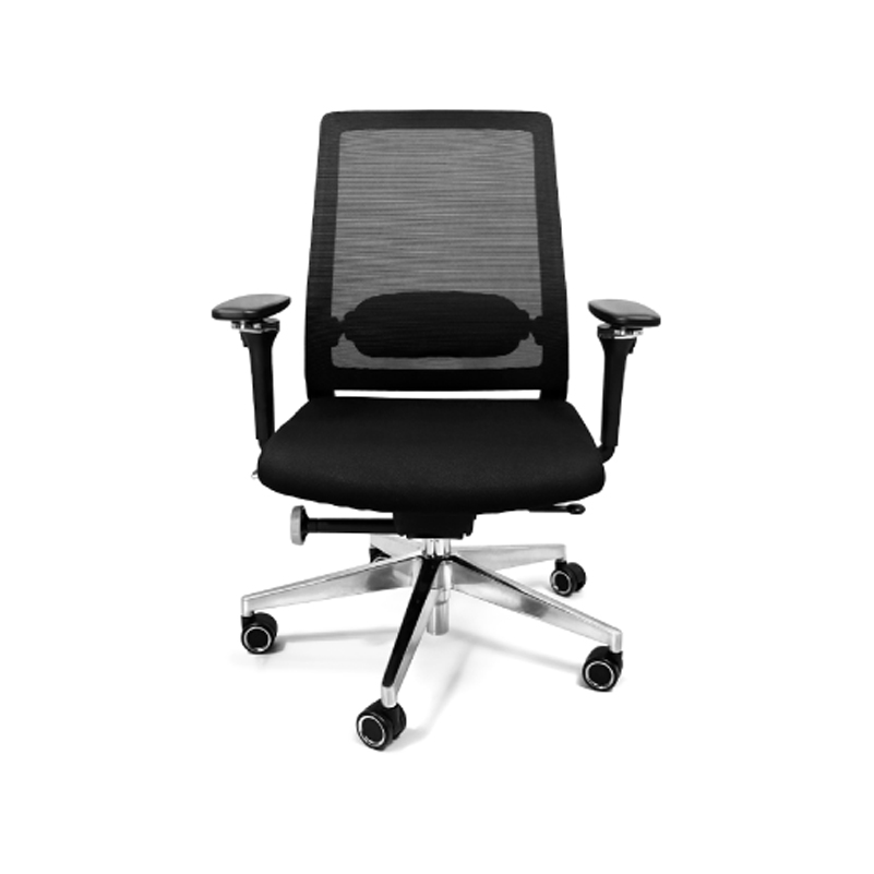 COLORES: Gris y negro ASIENTO: Tapizado en tela y con espuma de poliuretano inyectado RESPALDO: Tapizado en malla, con soporte lumbar ajustable en ángulo y profundidad BASE: De aluminio de 350 mm, con rodajas de PU de 60 mm y certificado BIFMA MECANISMO: Synchro “Cable Control”, con 5 bloqueos de reclinamiento, antishock, con slider y con palanca de ajuste de tensión del reclinamiento PISTÓN: Cromado con rebasador de base, clase 3 y con certificado BIFMA de 120,000 ciclos BRAZOS: 5D con pad de PU suave, con detalles en aluminio