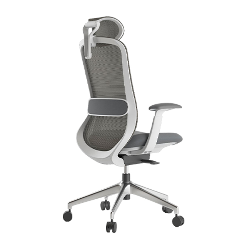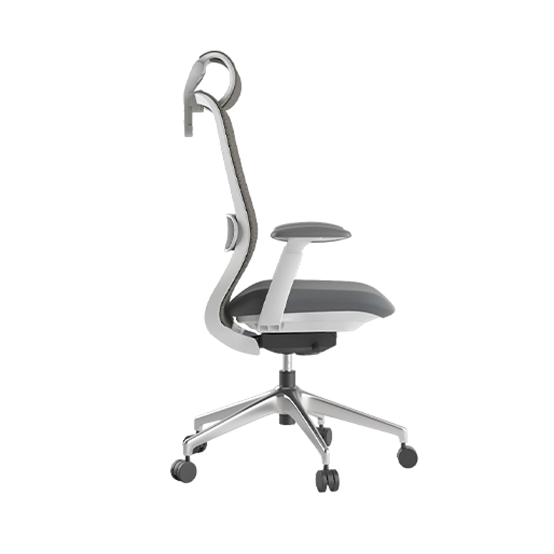 Silla con cabecera Base cromada Riñonera con ajuste de altura Asiento poliuretano tapizado Mecanismo syncro Brazo 4d con Pad suave Rodajas de nylon 60mm