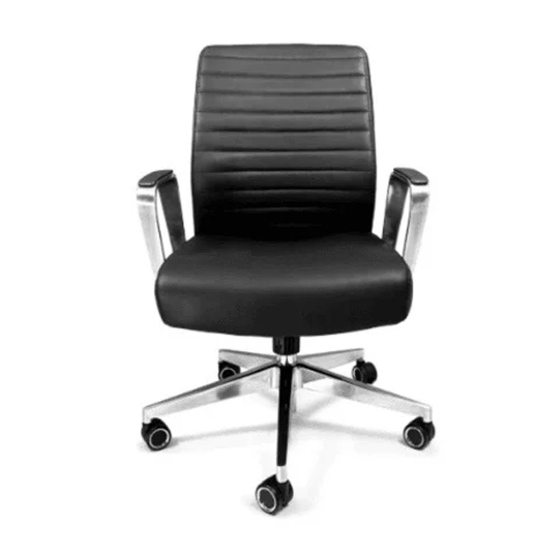 •Tapizada en piel vacuna alta calidad color negro. •Brazos de aluminio. •Respaldo bajo. •Pistón neumático. •Base de aluminio pentagonal y rodajas